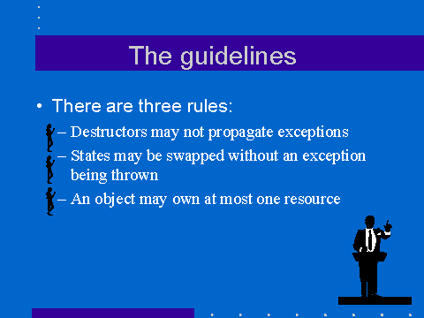 The second rule isn’t obvious, but is part of the key to exception safety. Even if a class owns resources, exchanging the states of two instances should be possible without allocating (temporary) resources or throwing an exception (if the allocation fails). For example the STL containers provide this facility by overloading std::swap(). We’ll see how useful the ability to swap states is in a moment.