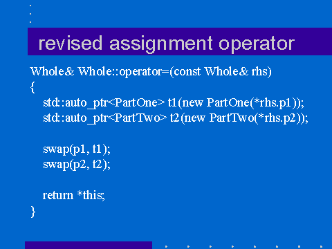 Not only is this shorter than the original exception-unsafe example, it meets the strong exception safety guarantee. (Sadly it doesn’t compile with Visual C++ - but a strategically placed “using std::swap” avoids the bugs in its name lookup.)